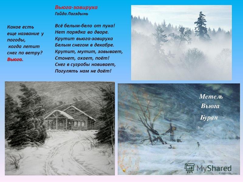 Какое есть еще название у погоды, когда летит снег по ветру? Вьюга. Вьюга-завируха Гайда Лагздынь Всё белым-бело от пуха! Нет порядка во дворе. Крутит вьюга-завируха Белым снегом в декабре. Крутит, мутит, завывает, Стонет, охает, поёт! Снег в сугробы навивает, Погулять нам не даёт!