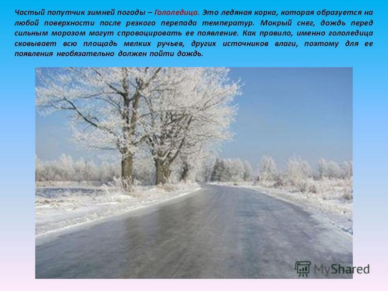 Частый попутчик зимней погоды – Гололедица. Это ледяная корка, которая образуется на любой поверхности после резкого перепада температур. Мокрый снег, дождь перед сильным морозом могут спровоцировать ее появление. Как правило, именно гололедица сковывает всю площадь мелких ручьев, других источников влаги, поэтому для ее появления необязательно должен пойти дождь.