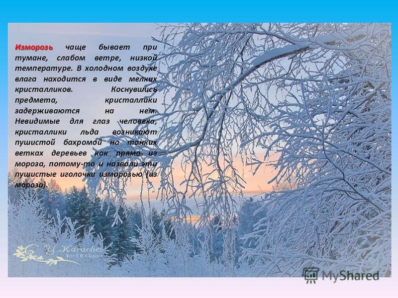 Изморозь Изморозь чаще бывает при тумане, слабом ветре, низкой температуре. В холодном воздухе влага находится в виде мелких кристалликов. Коснувшись предмета, кристаллики задерживаются на нем. Невидимые для глаз человека, кристаллики льда возникают пушистой бахромой на тонких ветках деревьев как прямо из мороза, потому-то и назвали эти пушистые иголочки изморозью (из мороза).