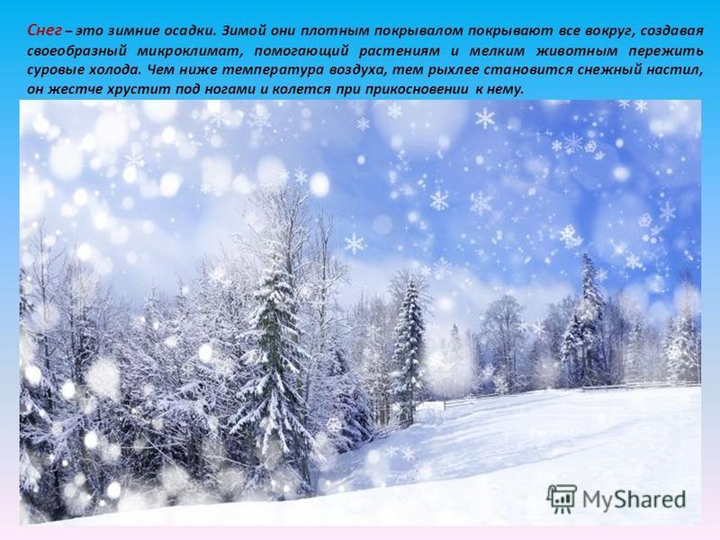 Снег – это зимние осадки. Зимой они плотным покрывалом покрывают все вокруг, создавая своеобразный микроклимат, помогающий растениям и мелким животным пережить суровые холода. Чем ниже температура воздуха, тем рыхлее становится снежный настил, он жестче хрустит под ногами и колется при прикосновении к нему.