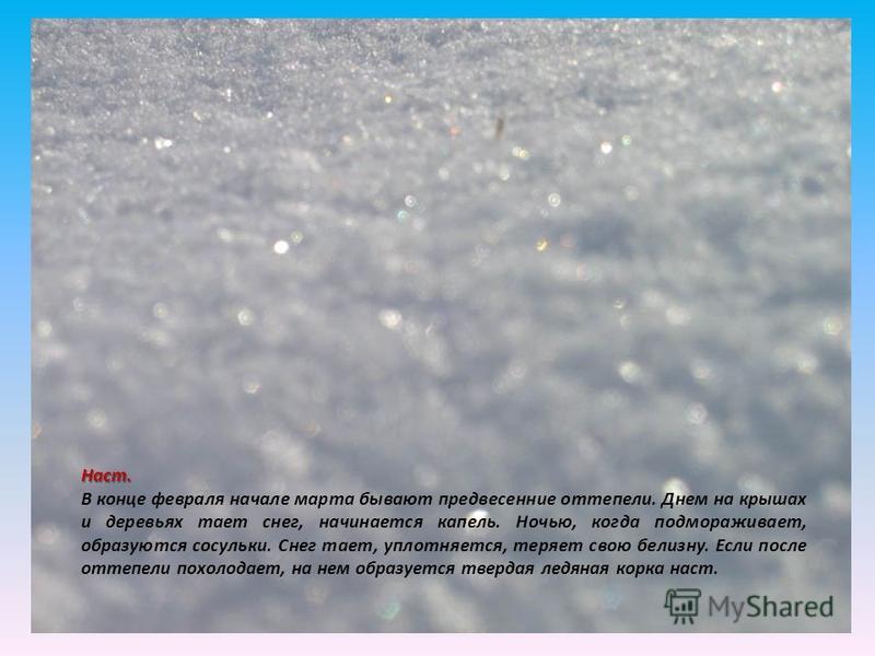 Наст. В конце февраля начале марта бывают предвесенние оттепели. Днем на крышах и деревьях тает снег, начинается капель. Ночью, когда подмораживает, образуются сосульки. Снег тает, уплотняется, теряет свою белизну. Если после оттепели похолодает, на нем образуется твердая ледяная корка наст.
