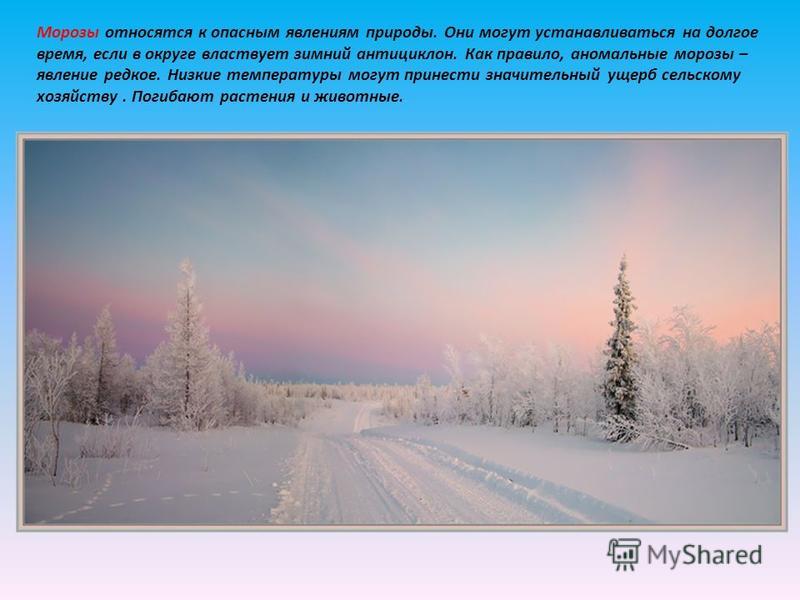Морозы относятся к опасным явлениям природы. Они могут устанавливаться на долгое время, если в округе властвует зимний антициклон. Как правило, аномальные морозы – явление редкое. Низкие температуры могут принести значительный ущерб сельскому хозяйству. Погибают растения и животные.