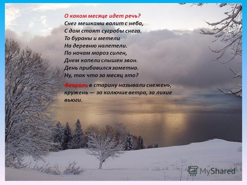 О каком месяце идет речь? Снег мешками валит с неба, С дом стоят сугробы снега. То бураны и метели На деревню налетели. По ночам мороз силен, Днем капели слышен звон. День прибавился заметно. Ну, так что за месяц это? Февраль Февраль в старину называли снежень, круженье за колючие ветра, за лихие вьюги.