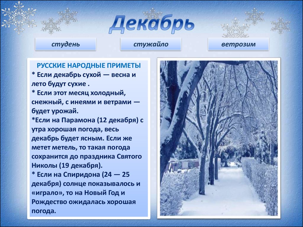 Декабрь — не самый холодный зимний месяц, но сильные морозы все же бывают, а с учетом того, что снега в декабре в последние годы выпадает все меньше, каждое наступление мороза при снежном покрове менее 10 см опасно для растений. Метелей и морозов зачастую нет до дня «солнцеворота» — 22 декабря. Затем наступает резкое похолодание.
