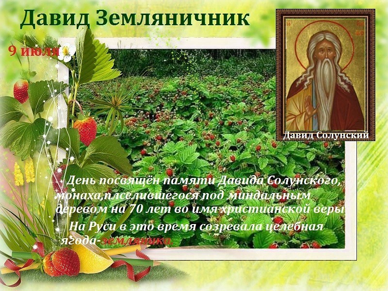 В пятницу 9 июля 2021 года по народному календарю – Давид Солунский, Давид Земляничник, Тихвинская икона Божией Матери, Тихвинская ягодница. В этот день отправлялись в лес по ягоды. Православная церковь 9 июля празднует явление Тихвинской иконы Божией Матери (1383) и вспоминает преподобного Давида Солунского – греческого святого, проживающего в V веке.