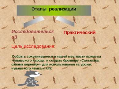 Этапы реализации Исследовательский Практический Цель исследования: Собрать сохранившиеся в нашей местности приметы чувашского народа и создать брошюру «Çанталăка сăнама вĕренĕр»» для использования на уроках чувашского языка и КРК