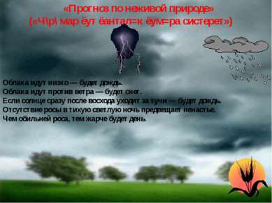 «Прогноз по неживой природе» («Ч\р\ мар ёут ёантал=к ёум=ра систерет») Облака идут низко - будет дождь. Облака идут против ветра - будет снег. Если солнце сразу после восхода уходит за тучи - будет дождь. Отсутствие росы в тихую светлую ночь предвещает ненастье. Чем обильней роса, тем жарче будет день.