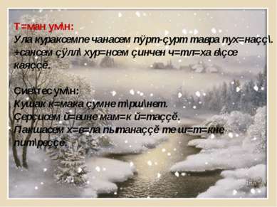 Третья группа Дым поднимается в небо столбом – к морозу. М=рьерен т\т\м çÿлелле х=парать – сивве. Собака валяется на снегу – к ненастью. Йыт= юр çинче й=валанать – çил-т=в=ла. К=макара вут= шартлатать – сивве.