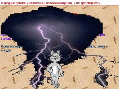 Первая группа «В доме свистеть нельзя – не будет денег». «Если услышишь первый гром, катайся по земле, кувыркайся через голову - так можно вырасти большим и сильным». Если восходящий молодой месяц увидишь справа, это к добру, слева – к худу. Народные приметы различны и по происхождению, и по достоверности.