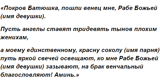 Касаемо еще одной важной приметы на Покров Пресвятой Богоматери говорилось выше: не рекомендуется отказывать сватам, иначе свадьбы девушке ждать три года. В случае, когда жених девушке совсем уж не по душе, но свадьбы долго ждать не хочется, лучше вовсе не пускать нежеланных сватов в дом, сделав вид, что он пуст.