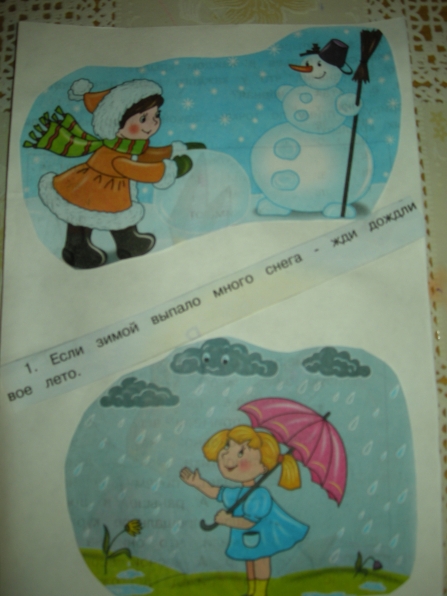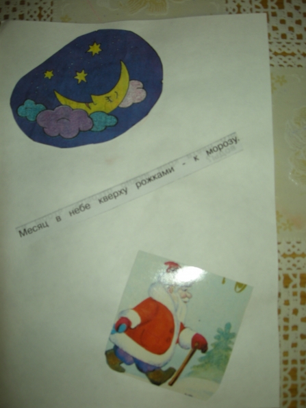 Мне очень понравилась идея Ирины Коваленко «Пословицы и поговорки» в картинках. И вот недавно у меня то же возникла идея на подобии Ирининой. А именно. В настоящее время, мы с детьми старшей группы, много говорим о приметах зимы. Дети учатся замечать, делятся своими наблюдениями, хотят узнать всё новые и новые приметы. А я решила им немного помочь. Подобрала соответствующие картинки (помогла детская газета «Солнецный зайчик», старые открытки) обсудили с детьми, что они означают. Вот, что у нас получилось: