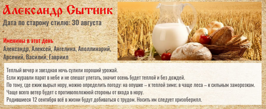 Срок сеять озимые: "Пришел Варфоломей, жито на зиму сей!" Срок сбора последних грибов. Срок молотить хлеба.