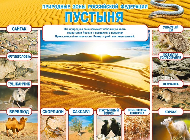 В пустынях обитают ёжи, суслики, тушканчики, змеи, ящерицы. Из птиц - жаворонки, зуйки, дрофы.