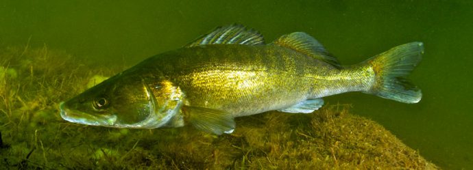 Может набирать вес до 12 кг, вырастая в длину до 60 дюймов. Характеризуется зеленоватым оттенком и расположением по бокам тела от 8-ми до 12-ти полосок темного цвета. Брюхо у судака светлое. Питается судак мелкой рыбой. Встречается в этих местах довольно редко.