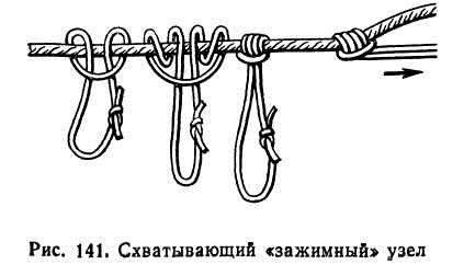 Схватывающий (зажимный) узел (рис 141) применяется для страховки при перемещении по веревке Он легко передвигается рукой, но при рывке или натяжении крепко фиксируется (за-