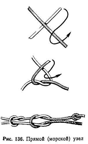 Две веревки одинакового диаметра надежно соединяются ткацким и прямым (морским) узлами (рис 135 и 136). Для связывания веревок разного диаметра применяются академический (рис. 137) и брам-шкотовый (рис 138) узлы.