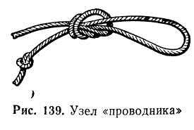 Узел «проводника» (рис 139) и узел «булинь» (рис 140) применяются для обвязки при страховке во время движения в горах на середине веревки — узел «проводника», на конце веревки узел «булинь» узлом «проводника» можно также быстро соединить две веревки