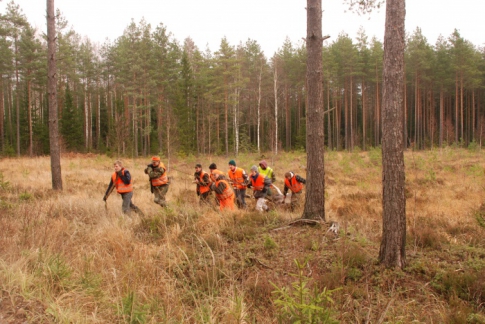Стрелки обязательно должны находиться на прямой линии сбоку друг от друга во избежание попадания в радиус выстрела. Когда капитан дает знак, загонщики начинают шуметь — сначала негромко, лишь переговариваясь, постепенно увеличивая громкость — и подгоняют лося к охотникам. До сигнального знака никто не должен шуметь, переговариваться и даже курить — все это может спугнуть лося.