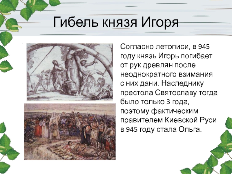 Согласно летописи, в 945 году князь Игорь погибает от рук древлян после неоднократного взимания с них дани. Наследнику престола Святославу тогда было только 3 года, поэтому фактическим правителем Киевской Руси в 945 году стала Ольга.
