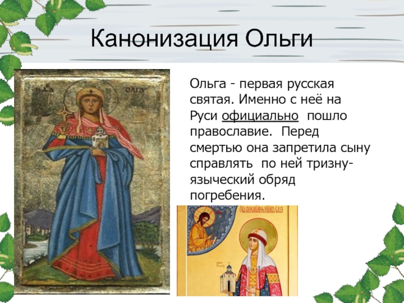 Ольга - первая русская святая. Именно с неё на Руси официально пошло православие. Перед смертью она запретила сыну справлять по ней тризну- языческий обряд погребения.