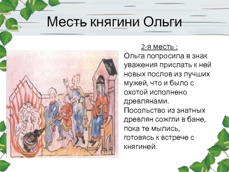 2-я месть : Ольга попросила в знак уважения прислать к ней новых послов из лучших мужей, что и было с охотой исполнено древлянами. Посольство из знатных древлян сожгли в бане, пока те мылись, готовясь к встрече с княгиней.