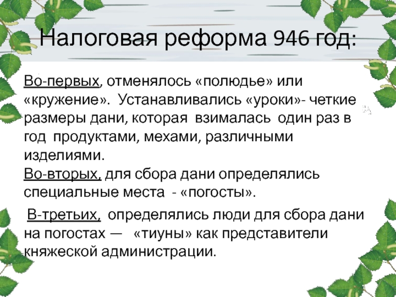 Во-первых, отменялось «полюдье» или «кружение». Устанавливались «уроки»- четкие размеры дани, которая взималась один раз в год продуктами, мехами, различными изделиями. Во-вторых, для сбора дани определялись специальные места - «погосты».