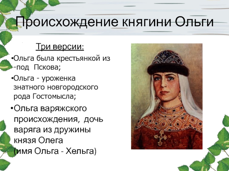 Ольга варяжского происхождения, дочь варяга из дружины князя Олега (имя Ольга - Хельга)
