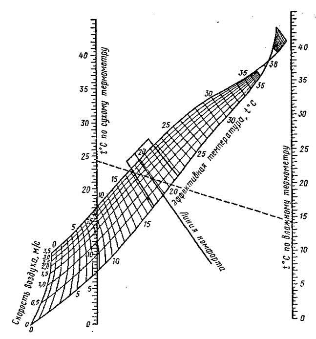 Рис. 7. Номограмма для определения эффективной температуры и зоны комфорта