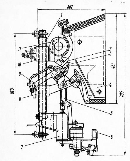 1 - стержень; 2 - контакт неподвижный; 3 - контакт подвижной; 4 - камера дугогасительная; 5 - тяга изоляционная; 6 - блокировка; 7 - привод пневматический; 8 и 10 - кронштейны подвижного и неподвижного контактов; 9 - рычаг; 11- катушка дугогасительная.