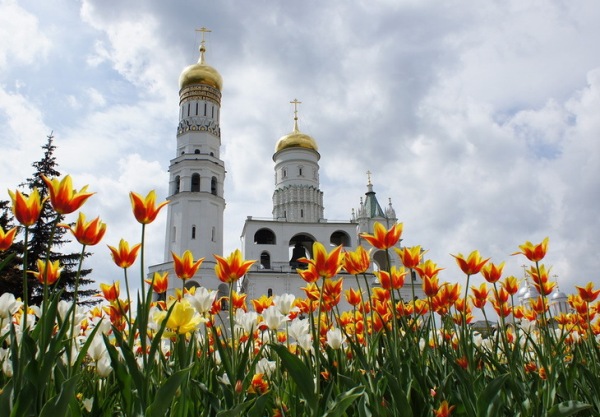 Слева направо: тюльпаны, анютины глазки, нарциссы