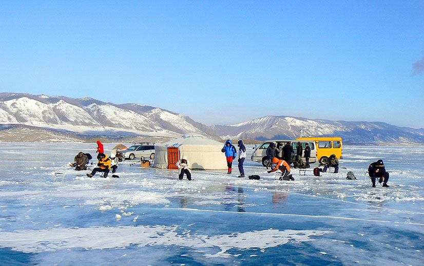 ◦ Завтракаем и выходим на подледную рыбалку Байкала. Лед Байкала прозрачный и толщина его доходит до 3-х метров. Рыбалка ведётся специальными удочками для подлёдного лова на Байкале. В основном ловятся в Малом море окунь, сорога и омуль. Под толщей льда в прозрачной байкальской воде можно увидеть не только саму рыбу, но и сам процесс её ловли на крючок. Это зрелище настолько увлекательно, что лунку для подлёдной рыбалки называют«телевизором». В зависимости от погоды, клёва и азарта рыбалка может продолжаться целый день.
