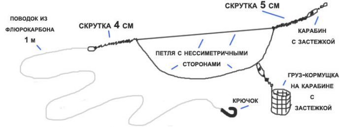 Чтобы связать ассиметричную петлю, нужно взять отрезок лески, длиной около 2-х метров и сложить его пополам. Отмерив от конца 40-50 см, формируется петля для крепления поводка. После этого, берутся свободные концы и складываются вместе, но так, чтобы один конец был длиннее другого на 20 см, после чего вяжется двойной узел. Ассиметричная петля готова. Чтобы облегчить крепление кормушки, на более длинный конец, перед завязыванием узла, одевается вертлюжок с карабином. Все не нужные концы лески обрезаются.