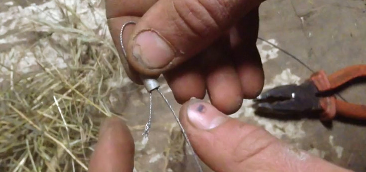 Обычно такие ловушки на зайца легко сделать своими руками. Для изготовления ловушки, используют проволоку, стальную или медную, либо стальной тросик, толщиной 0,7 – 1 мм. Делать лучше из проволоки помягче, слишком упругая может сама распустить петлю выпустив зайца. Для изготовления петли нам понадобятся проволока или тросик длинной около 1 метра, две алюминиевые пломбы и плоскогубцы.