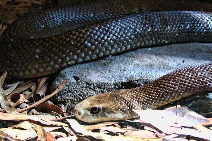 Место обитания этой змеи, неизменно остается Австралия. Есть мнение, что один укус этой змеи способен убить 12 тысяч морских свинок. Имеет коричневую окраску тела, большие клыки и оранжевые глаза.