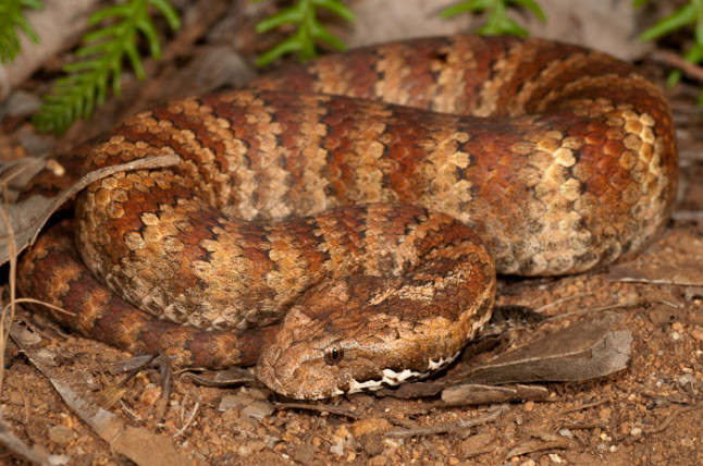 Одна из самых ядовитых змей в мире обитает в засушливых районах Австралии, где охотится на мелких позвоночных животных, ящериц и лягушек. Acanthopis antarcticus – очень хитрый хищник, который прячется среди листьев и травы, поджидая свою добычу. Как правило, змея охотится в ночное время, а после сезона размножения самка заползает в нору, где её поджидают 20 «милых маленьких змеёнышей», уже смертельно ядовитых.