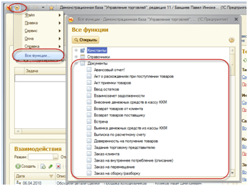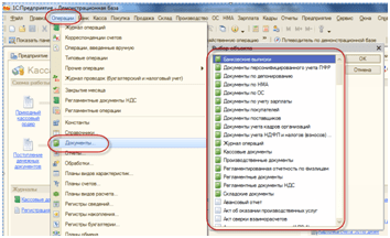 Аналогично, как и со справочниками, в режиме 1С Предприятие пользователь видит не какое-то стандартное меню 1С, а интерфейс, разработанный программистом. Поэтому угадать куда программист положил конкретный документ нельзя. Как фантазия позволила.