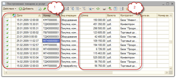 Каждый документ представляется в журнале документов отдельной строкой. Журнал содержит колонки, состав которых настраивается программистом. Кроме того, форма журнала документов может содержать любые другие элементы управления: кнопки, переключатели, информационные поля. Они могут быть сверху, снизу или сбоку.