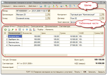 При двойном щелчке мышкой на конкретном документе – открывается форма (т.е. окно) самого документа. Она делится на «шапку» (обычно основные перечисленные выше поля) и закладки с табличными частями (таблицами).