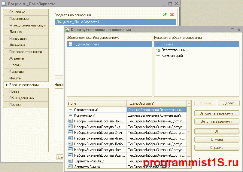 Документ может быть введен на основании плана обмена, справочника, бизнес-процесса, задачи или другого документа. Для удобства можно воспользоваться специальным конструктором ввода на основании, который автоматически сгенерирует модуль обработчика заполнения: