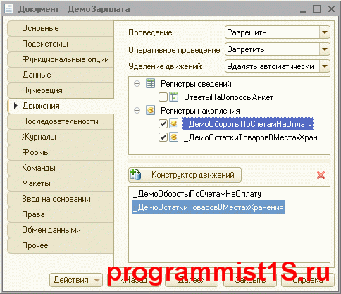 Самая важная вкладка, на которой определяется состав регистров, по которым будет делать движения документ: