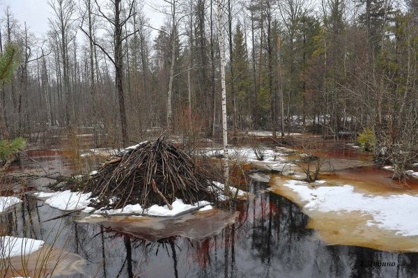 Так как зимой можно и не заметить бобровые хатки, занесенные снегом, то их надо присмотреть заранее, пока снежный покров еще не слишком обилен.