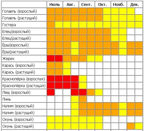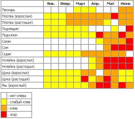 Такую действительно актуальную табличку теоретически можно создать – отдельно для каждого пруда, озерца, небольшого участка крупного водоема и т.д. Причем, после многолетних исследований и наблюдений.