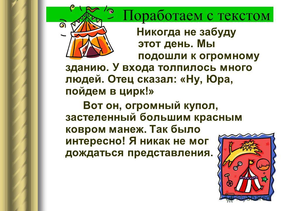 Поработаем с текстом Никогда не забуду этот день. Мы подошли к огромному зданию. У входа толпилось много людей. Отец сказал: «Ну, Юра, пойдем в цирк!» Вот он, огромный купол, застеленный большим красным ковром манеж. Так было интересно! Я никак не мог дождаться представления.