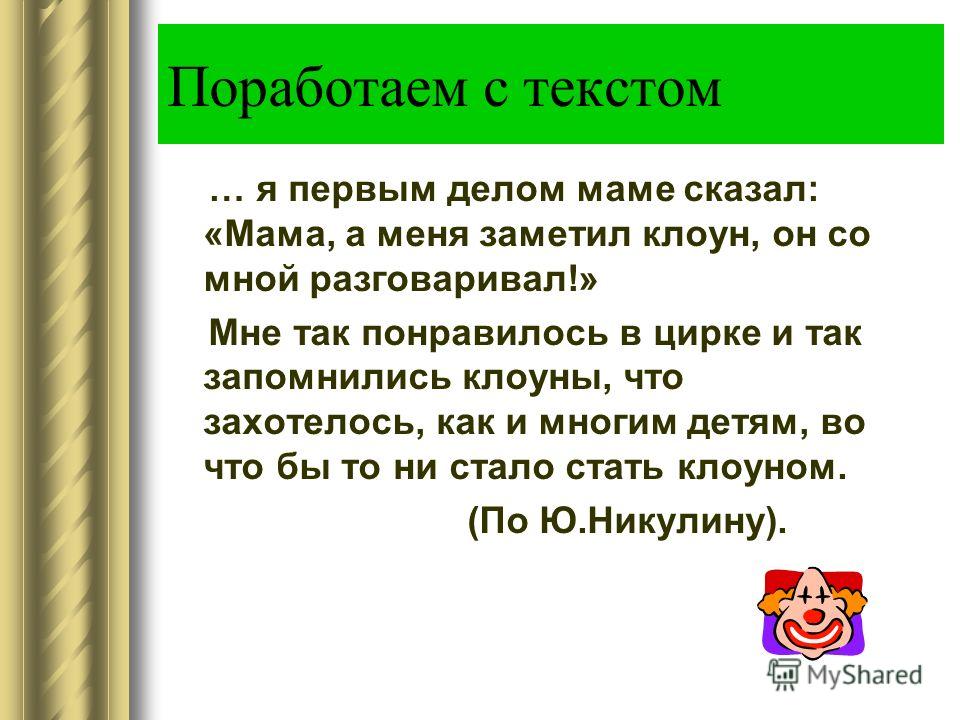Поработаем с текстом Клоуны остались в памяти навсегда. Очень поразил меня трюк с цилиндром. Клоун вынимал из него огромное количество предметов: круг колбасы, гирлянду сосисок, двух живых куриц, батоны хлеба. Курицы махали крыльями, все вокруг смеялись. Я громко кричал. Один из клоунов передразнил мой крик. Все от этого засмеялись. «Папа, папа! – задергал я отца. – Клоун мне ответил! Ты слышал?!» Когда мы вернулись домой, …