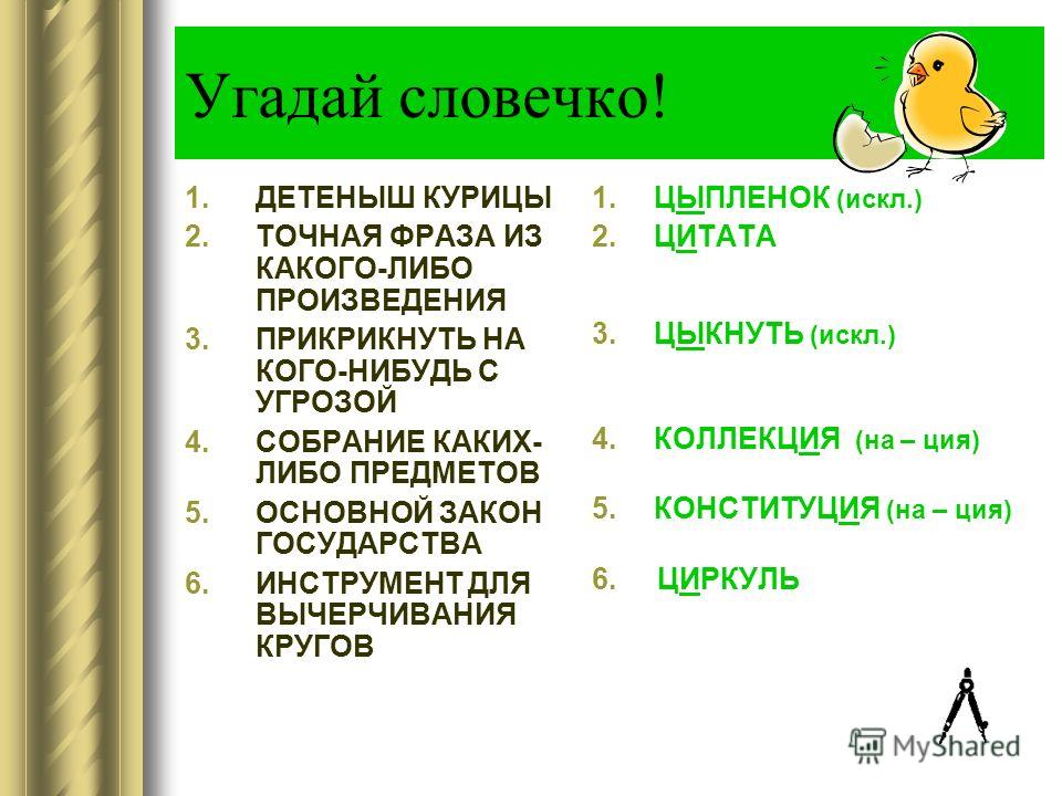 Угадай словечко! 1.ДЕТЕНЫШ КУРИЦЫ 2.ТОЧНАЯ ФРАЗА ИЗ КАКОГО-ЛИБО ПРОИЗВЕДЕНИЯ 3.ПРИКРИКНУТЬ НА КОГО-НИБУДЬ С УГРОЗОЙ 4.СОБРАНИЕ КАКИХ- ЛИБО ПРЕДМЕТОВ 5.ОСНОВНОЙ ЗАКОН ГОСУДАРСТВА 6.ИНСТРУМЕНТ ДЛЯ ВЫЧЕРЧИВАНИЯ КРУГОВ 1.ЦЫПЛЕНОК (искл.) 2.ЦИТАТА 3.ЦЫКНУТЬ (искл.) 4.КОЛЛЕКЦИЯ (на – ция) 5.КОНСТИТУЦИЯ (на – ция) 6. ЦИРКУЛЬ
