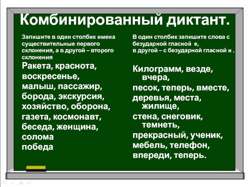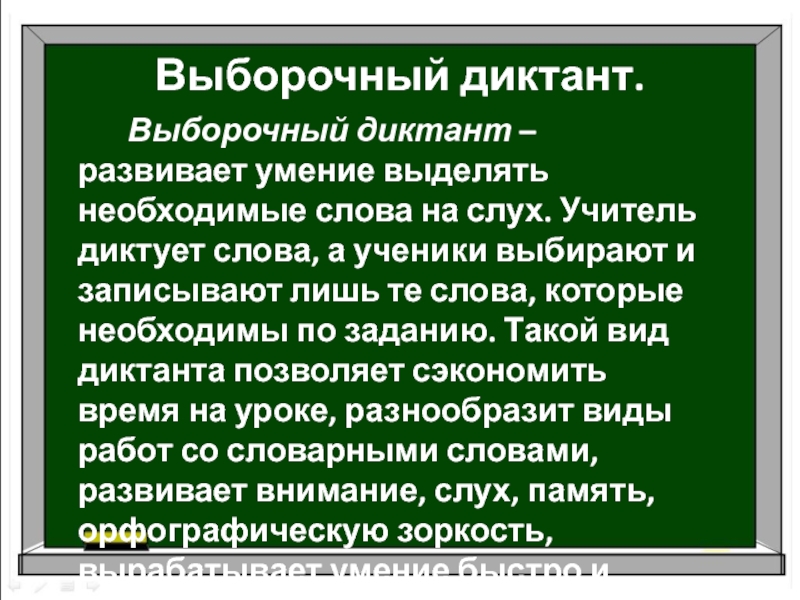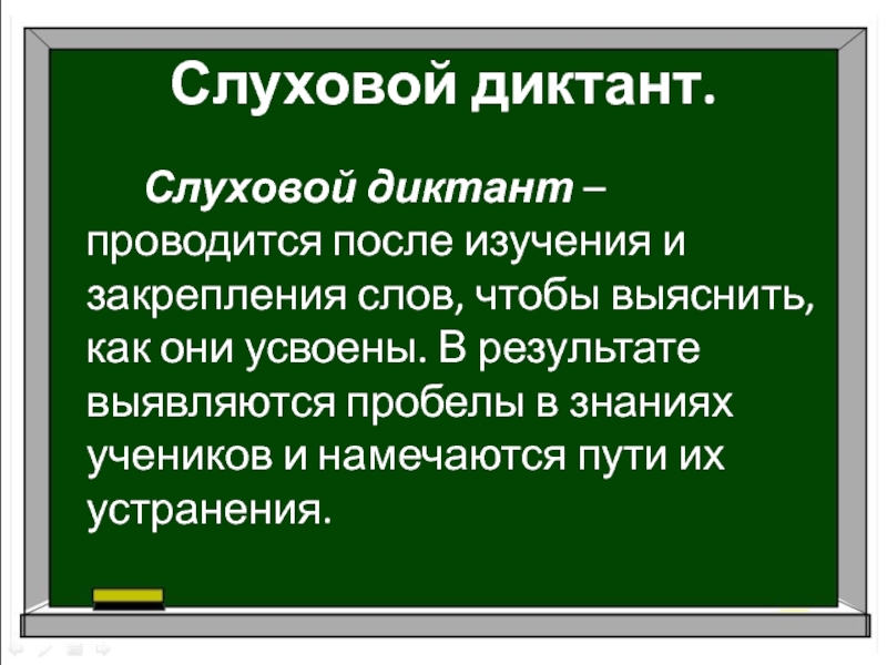 Слуховой диктант – проводится после изучения и закрепления слов, чтобы выяснить, как они усвоены. В результате выявляются пробелы в знаниях учеников и намечаются пути их устранения.