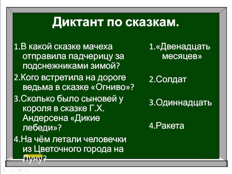 1.В какой сказке мачеха отправила падчерицу за подснежниками зимой?