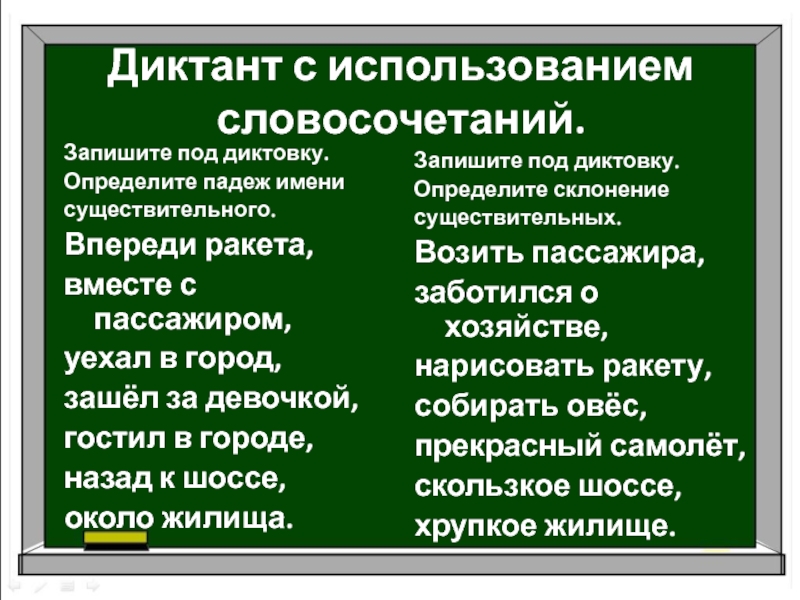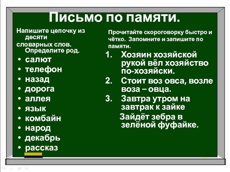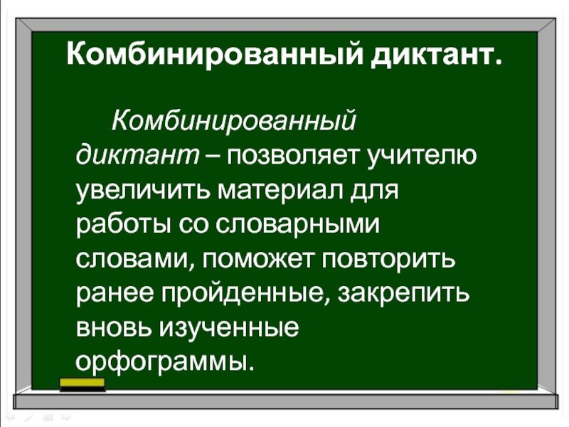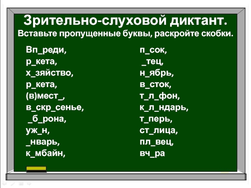 Зрительный диктант – нужно чередовать со зрительно-слуховым диктантом, давать его можно не только в виде пропущенных букв, но и пропущенных слов. Ценность этого вида работы заключается в том, что, чередуя анализ и синтез слова, ученики предупреждают ошибки ещё до написания слова.