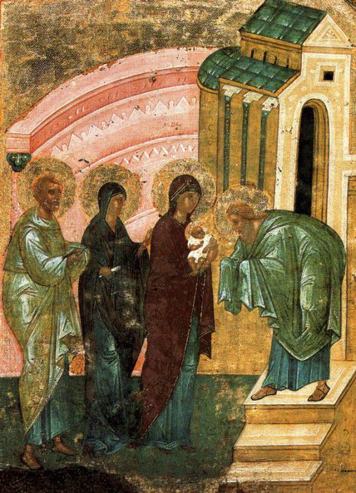 Марию и её мужа Иосифа с маленьким Христом встретили святой старец Симеон и старица Анна 84-х лет. Симеону было обещано ангелом: «не вкусишь смерти, доколе не увидишь Христа, Который родится от Чистой и Пренепорочной Девы».