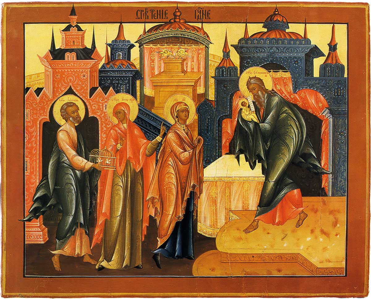 В Иерусалимском храме святое семейство встретили праведник Симеон, предсказавший ребёнку великое будущее: «Видели очи мои спасение Твое, Которое Ты уготовал пред лицом всех народов, Свет к просвещению язычников, и славу народа Твоего Израиля», и пророчица Анна, тут же начавшая славить Господа и говорить о нем всем людям, ожидавшим избавления в Иерусалиме.